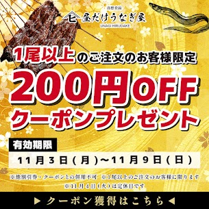 ▶ 쿠폰 기간: 11월 3일(월) ~ 11월 9일(일) ▶ 쿠폰 혜택: 장어 ‘1마리(一尾)’ 이상 주문 고객님께 200엔 할인