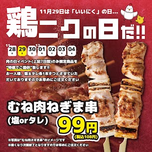 From now until December 4th (Thu), enjoy our special “Chicken Breast Negima Skewer” for just 99 JPY (108 JPY with tax).