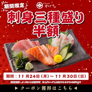 【Exclusive Coupon for LINE Members】 ▶︎ Offer Details Get our “3-Kind Sashimi Assortment” for 50% OFF! ▶︎ Validity Period Monday, November 24, 2025 – Sunday, November 30, 2025 ・Terms & Conditions ※Cannot be combined with any other discounts or coupons.