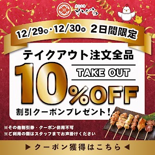 年末年始はご自宅でゆっくり過ごしたい、という方も多いのではないでしょうか。 そんな「お家時間」を贅沢に彩る、当店のテイクアウトはいかがですか? 今ならなんと、テイクアウトのご注文で「お会計から10%OFF」になる特別クーポンをご用意しています! お店で提供している本格的な炭火焼鳥の味を、そのまま食卓でお楽しみください!