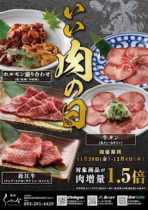 Great news for those who missed “Good Meat Day”! We are holding a special event until December 4th. The volume of target meat items is increased to 1.5 times! Target items include Omi beef rare parts, Beef tongue, and Assorted hormones. Please come to our best yakiniku restaurants kanayama and enjoy a lot of delicious meat!
