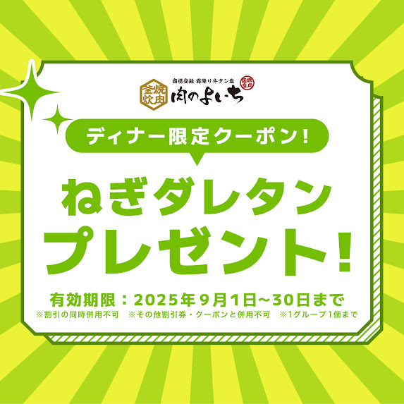 飲食事業 【肉のよいち】9月限定】特別クーポンをご用意!! 2025.09.01 いつも「肉のよいち 太田川駅前店」をご愛顧頂きありがとうございます。 本日は9月限定でお得な様々なクーポンをご用意いたしましたのでご紹介させていただきます 【スペシャルクーポン】 ●ランチ限定 ちょいプレゼント ●ディナー限定 飲み放題1,200円 ●ディナー限定 ねぎダレタンプレゼント ●ビアガーデン限定 500円OFF 期間限定のスペシャルクーポンとなっておりますので是非、この機会にご利用ください 皆様のご来店心よりお待ちしております ■店舗概要 肉のよいち 電話番号:0562-85-4646 店舗住所:愛知県東海市大田町下浜田90-40 営業時間 ●月〜木曜日 11時00〜15時00/16時30〜22時00 ●金曜日 11時00〜15時00/16時30〜22時30 ●土曜日 11時00〜22時30 ●日曜日 11時00〜22時00 店休日 :年中無休 公式LINE:https://lin.ee/OXH3yc3B ■本社概要 株式会社HKホールディングス 代表取締役:沓名 英樹 電話番号 :052-228-9223 住所 :愛知県名古屋市中区栄2丁目9-5東海ビル7階 営業時間 :10時00~19時00(土・日・祝を除く) Tweet Share Hatena Pocket RSS feedly Pin it 【中華そば おにぎり 番い-tsugai】中華そばと... 【焼肉くつな 金山本店 】UberEatsやってます...